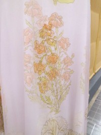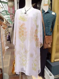 二枚重ねで、オーガンジーの上生地、インドコットンの下生地、ともにプリントがあります。透け感のある上生地ですので、下生地の柄と重なり、ゆらゆらと柄が動きます。とても上品な、着心地もはんなりしたお品物です。