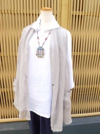 麻の生地は、今日みたいな晴れた日に着て頂くと、光沢が出てとても美しい素材です。もちろん吸湿にも優れる夏素材ですので、この時期におススメの素材ですよ☆